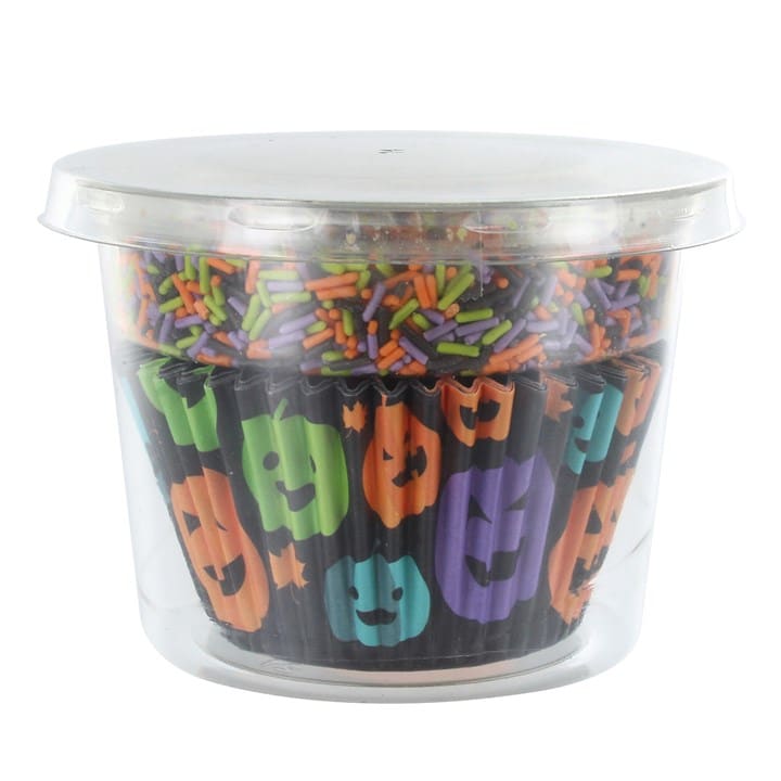 Eye catching Halloween pumpkin baking cases with a matching assorted black, purple, orange and green sprinkle mix are the perfect pairing for seasonal treats.