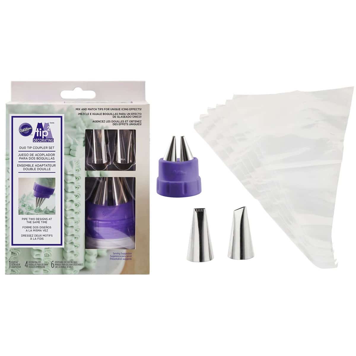 Get creative with your cake decorating skills when you use this duo tip coupler set. It allows you to use two different decorating tips at the same time to create two different designs. You won’t ever want to put it down. Set includes: duo coupler, petal tip #104, star tip #22, round tip #10, basketweave tip #48 and 6 disposable decorating bags